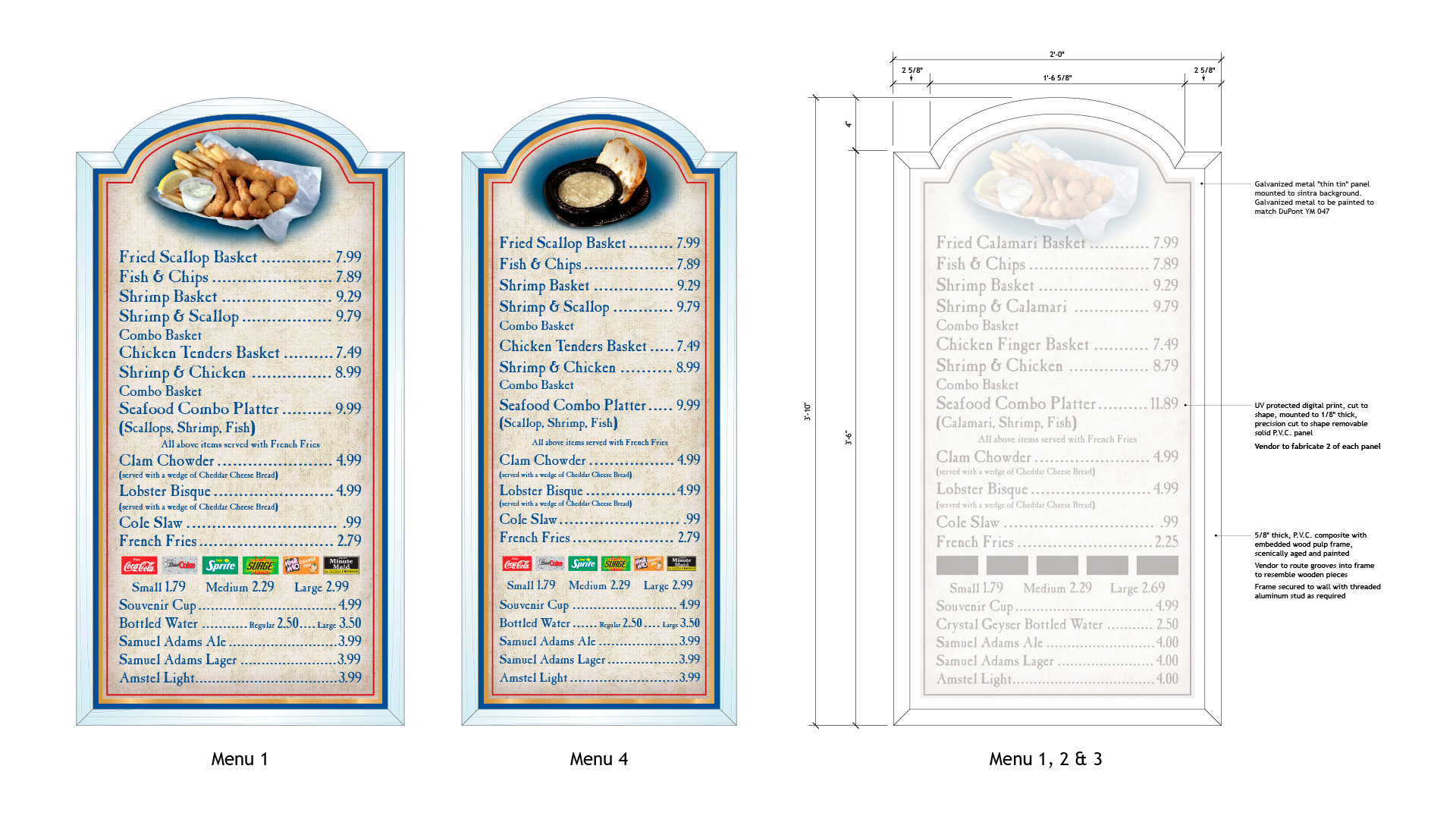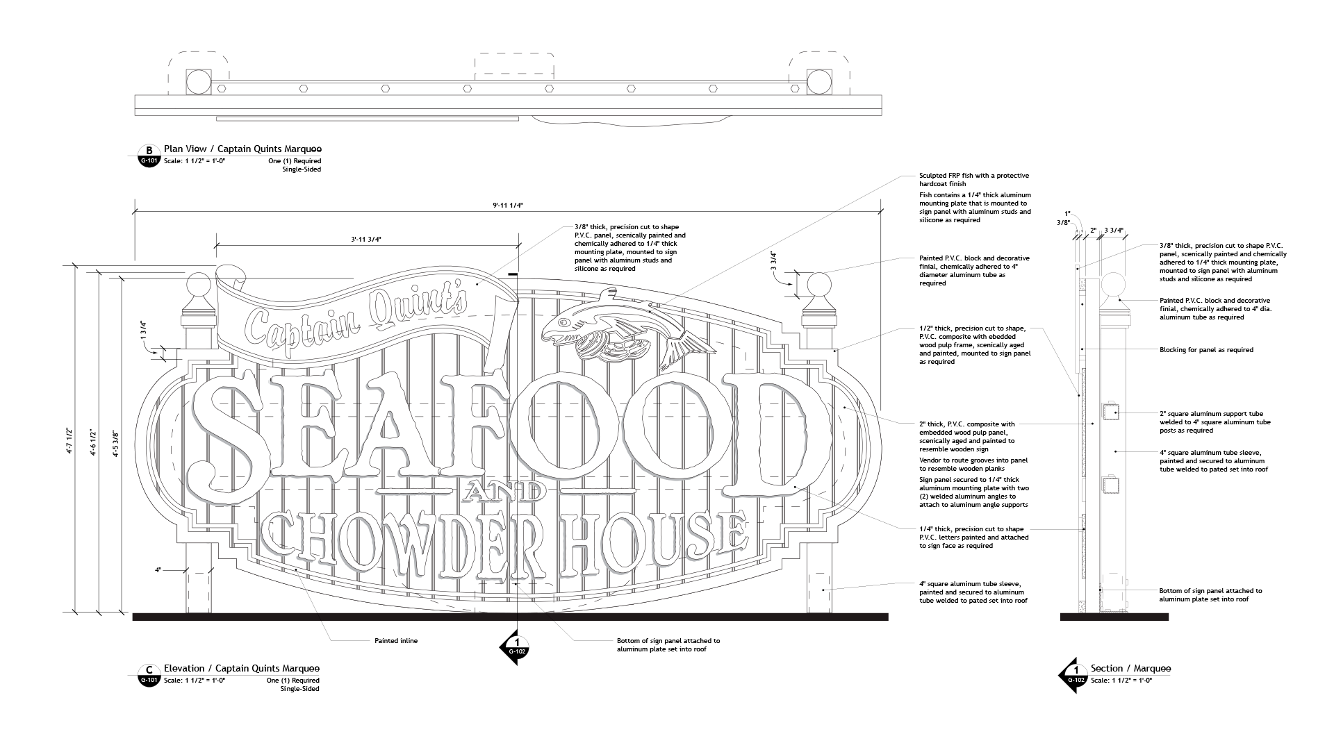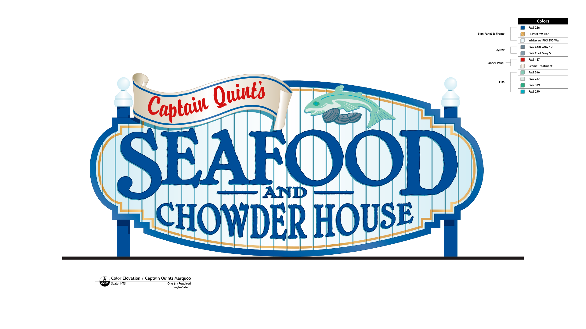 For Captain Quint’s Seafood & Chowder House, I led the design and documentation of a custom marquee and menu system that balanced strong thematic storytelling with the realities of fabrication, durability, and high-traffic guest environments. The work translated the venue’s nautical identity into a cohesive visual language—typography, color, illustration, and dimensional form, while ensuring the signage system meant to be read clearly at a distance, withstand outdoor conditions, and integrate seamlessly with the surrounding architecture. From concept through detailed construction drawings, the focus was on creating signage that felt authentic to the place, legible at scale, and engineered to live reliably in the real world.