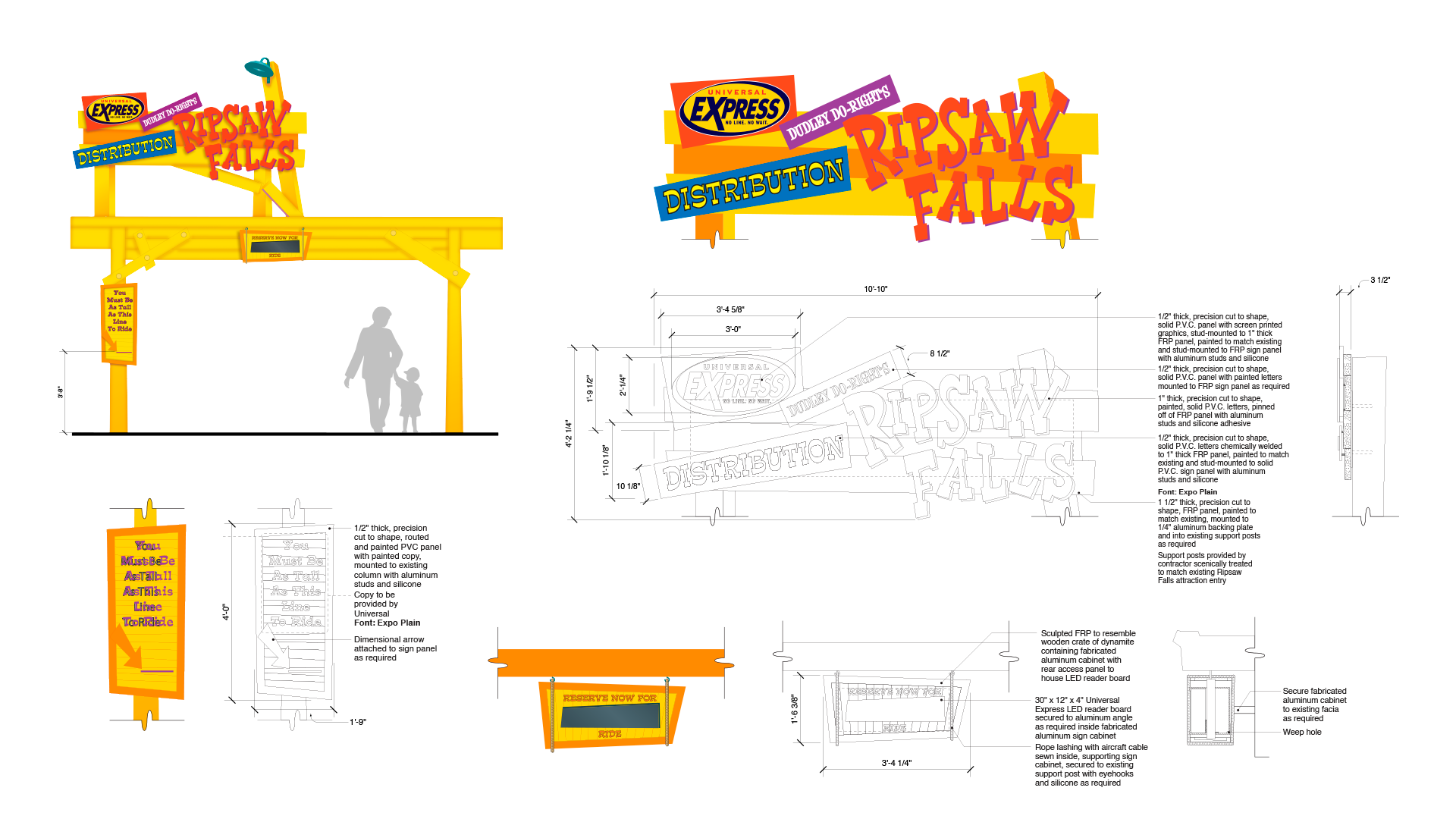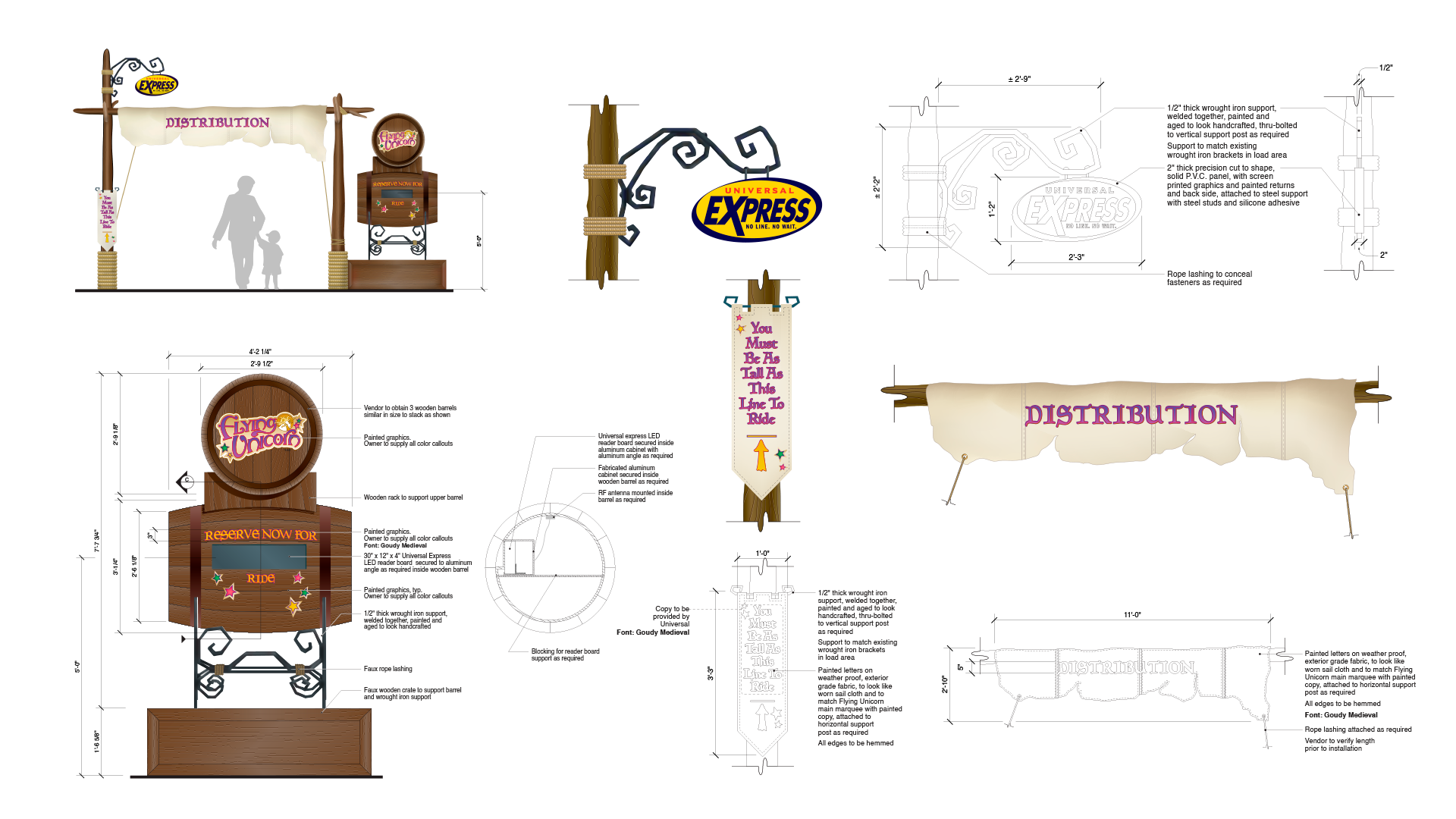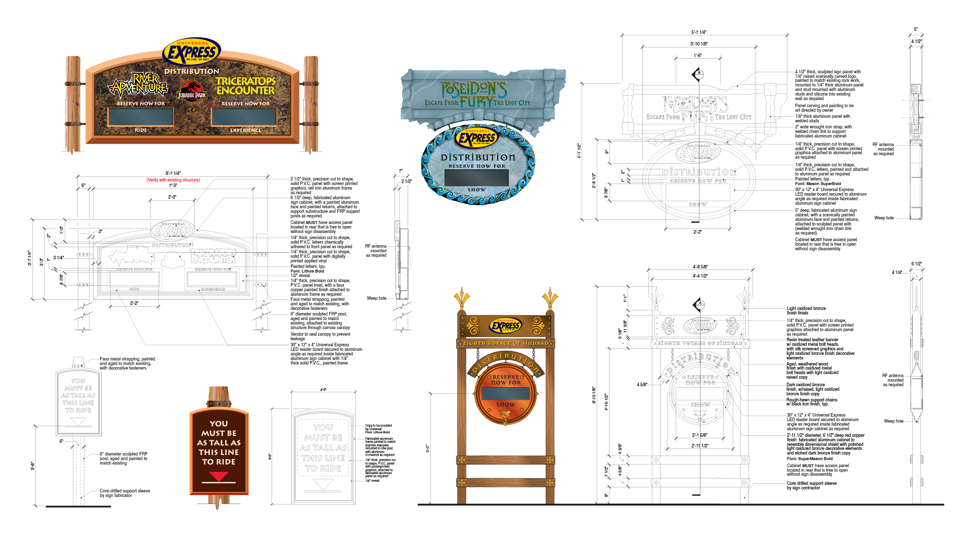 The Universal Express distribution system required a flexible signage approach capable of adapting to multiple themed environments while maintaining a consistent operational function. Working with Falcon’s Treehouse, I designed custom Express signage for individual lands throughout Universal’s Islands of Adventure, each tailored to its surrounding architecture, materials, and narrative style.
